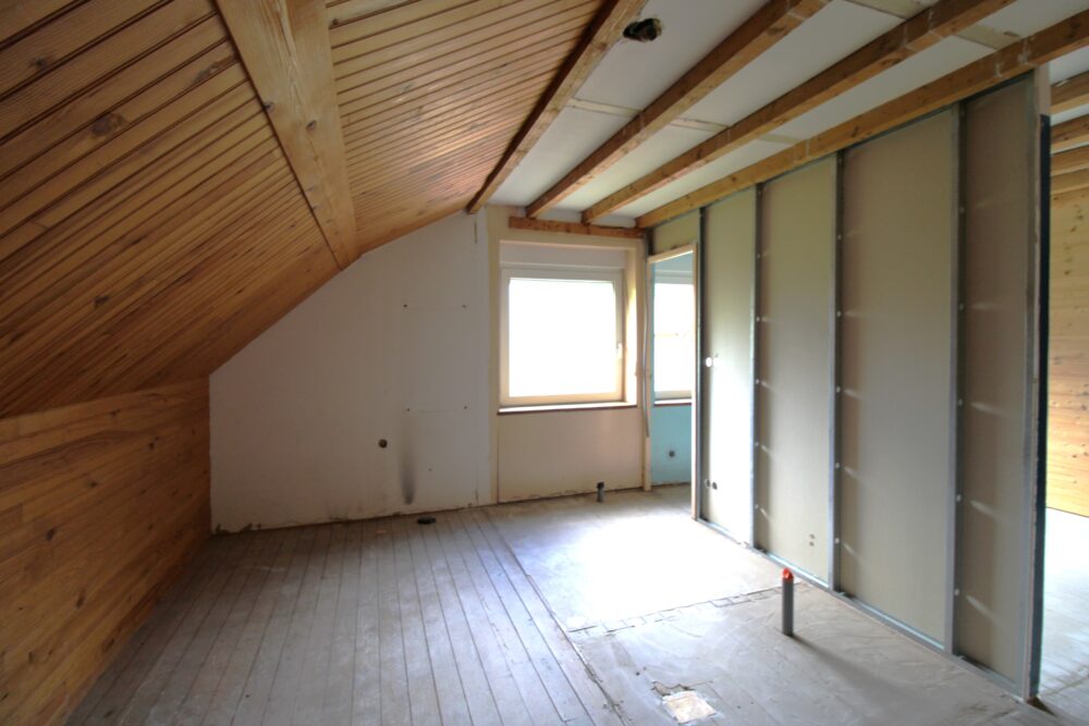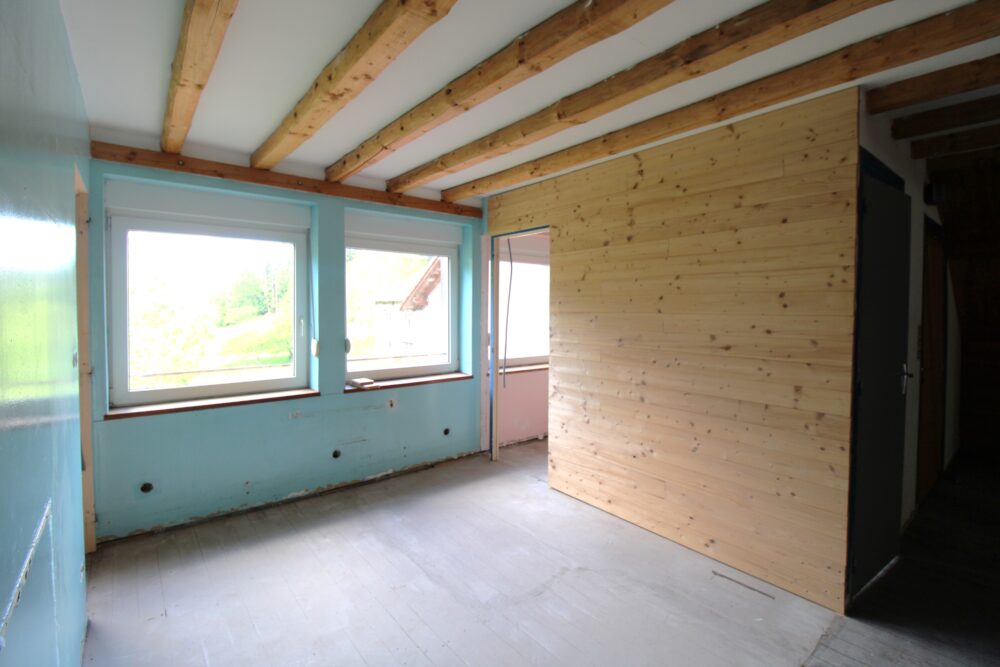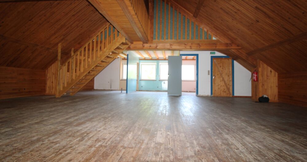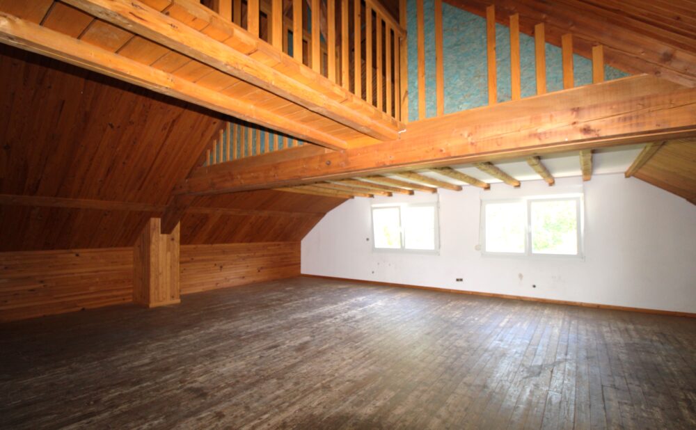 Accès étage par escalier et une passerelle offrant deux chambres borgnes fortement mansardées